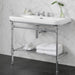Polished Chrome washstand. - Option to order with or without tap holes; - Two legs with distinctive tee joint detailing; - Towel rail and rack for storage; - Wall anchors included.